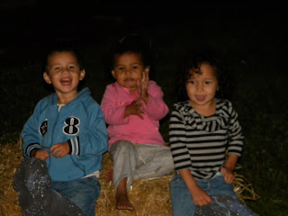 When it got dark we loaded up all the kids (babies too) on a tractor for a haunted hay ride. That was a big thrill for the kids. It was very scary with lots of special effects and guys dressed up in crazy costumes that jumped out from the vines and from behind pumpkins to chase the tractor. It was lots of fun. The babies were a little afraid. Brice was a lot afraid. Kambree was too small to care. After the haunted hay ride we headed over to the bon fire site that we had reserved and roasted hot dogs and made s'mores. The babies sat like angels in the lawn chairs we brought, snuggled under blankets eating their food (later, our chairs were covered in chocolate and marshmallow). It was a terrific night. I highly reccommend Eckert's to anyone. The bon fire was amazing. We sang to the babies and had a great time together as a family.