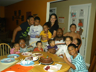 Monday night (their actual birthday) Albert's sister and her two little boys came over and we did cake and presents. We stuffed our scarecrow whom we affectionately call "Henry." We got Henry the year I had the twins, in fact, Henry was brought home (also interestingly, from Eckert's Bellevillle location) on the exact day I was at the never ending non stress test that resulted in bed rest for the remainder of the pregnancy. Every year we buy hay and stuff Henry for the fall holidays.