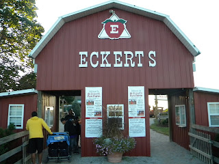 Our twins turned three! Wow, that was a fast three years. I'm not sure where the time went but it's been an amazing, wonderful three years. Last Friday, we took them to Eckert's Orchard to celebrate thier wonderful milestone. The orchard they have in Millstadt, IL is absolutely amazing, and features breathtaking views of the cityline of St. Louis city. The kids rode on a few rides, like the spinning apples, and the swings, visited the animals in the little petting paddock (they had the cutest baby goats). We watched the orchard folks shoot pumpkins out of a cannon (so much fun) and went to the pig races. Pig races are a blast, for anyone who hasn't seen one!