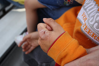 Last week, I came home from Brandon's pediatric appointment to learn that Brice had cut his hand...with scissors. Why he was allowed to play with scissors was an issue we explored later, but for the immediate time being, it was obvious that it would need a couple stitches. I packed him up and ran him up to Urgicare where the doctor there confirmed he'd need....2 stitches. OR...we could use the Dermabond which is basically skin glue. It goes on in a minute and a half and no shots/no pain. Pretty easy choice. The sore spot came at the end of the visit when the nurse told us to keep the hand STILL for a day. Lots of books and movies she told us. Um, does she KNOW Brice?