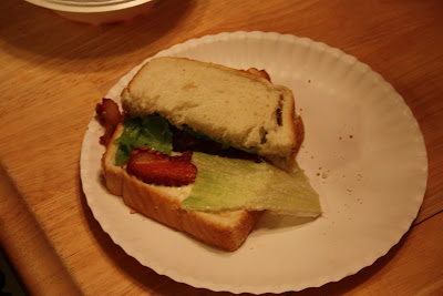 Because making BLT's for a dozen people (and it turned out to be 13, tonight) takes quite a bit of bacon, I buy it in the box from our local grocery store. The box is a a bit pricey...seventeen bucks to be exact, but still a deal for me, as by the time I purchase enough packs to feed the crowd (remembering that all except the littles will certainly eat at least two sandwiches) I'd easily spend at least that much, if not more. Plus, the box of bacon is great for sandwiches. See? It says so...right here on the box.